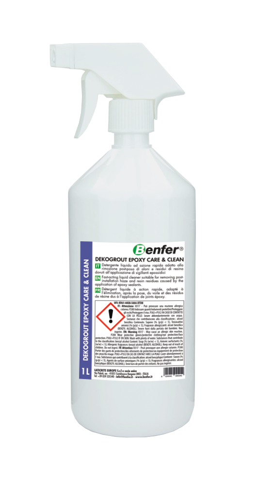 DEKOGROUT EPOXY CARE & CLEAN is a special ready-to-use water-based detergent composed of a solution of high activity surfactants suitable for removing residues and halos left by epoxy sealants on ceramic coatings. DEKOGROUT EPOXY CARE & CLEAN is available in comfortable 1 L spray for easy and waste-free use.