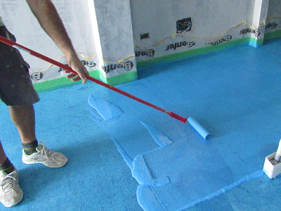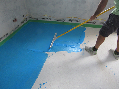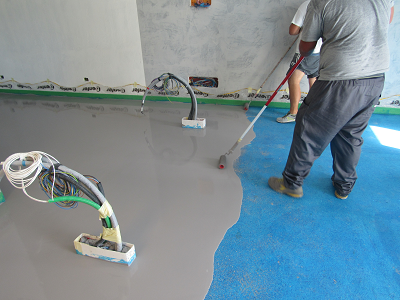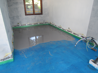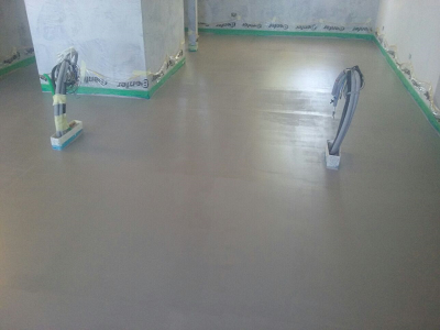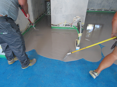 Making of a floor with VARIOPLAN-HD in an open-space apartment , at ground floor in a building with direct access to the beach. STARPRIM Primer was used on a newly built screed , two coats were laid, one with rubber scraper and the other one with a roller. The floor was created with no joints, except for the perimetral ones, with thickness of 5 mm of VARIOPLAN-HD. At the centre of the open-space, close to some tubes of the system, two formworks at measure were made to contain the self-levelling product. We remark that even the shower tray is at the same level as the floor.